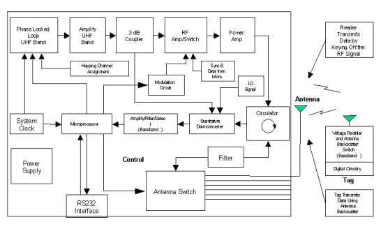 一套完整的RFID系統, 是由閱讀器(Reader)與電子標簽(TAG)也就是所謂的應答器(Transponder)及應用軟件系統三個部份所組成, 其工作原理是Reader 發射一特定頻率的無線電波能量給Transponder, 用以驅動 Transponder電路將內部的數據送出,此時 Reader 便依序接收解讀數據, 送給應用程序做相應的處理。