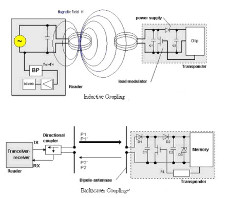 以RFID 卡片閱讀器及電子標簽之間的通訊及能量感應方式來看大致上可以分成, 感應偶合(Inductive Coupling) 及后向散射偶合(Backscatter Coupling)兩種, 一般低頻的RFID大都采用第一種式, 而較高頻大多采用第二種方式。