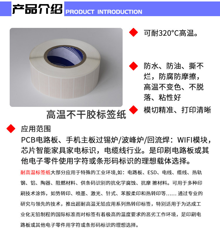 耐高溫標(biāo)簽材料以聚酰亞胺薄膜為基材,涂以進(jìn)口耐高溫有機(jī)硅壓敏膠而成。膠帶具有極好的耐高溫性,電絕緣性,抗化學(xué)性,且無毒、無異味、對(duì)人體及環(huán)境無害。由于具有極低的離型剝離力(可自動(dòng)模切、排廢、貼標(biāo)),適用于PCB、鋼材、鋁材等高溫場合下的可識(shí)別跟蹤標(biāo)簽;并可制成各種高溫標(biāo)簽,使用起來十分方便,是近年發(fā)展起來的新型標(biāo)簽品種。