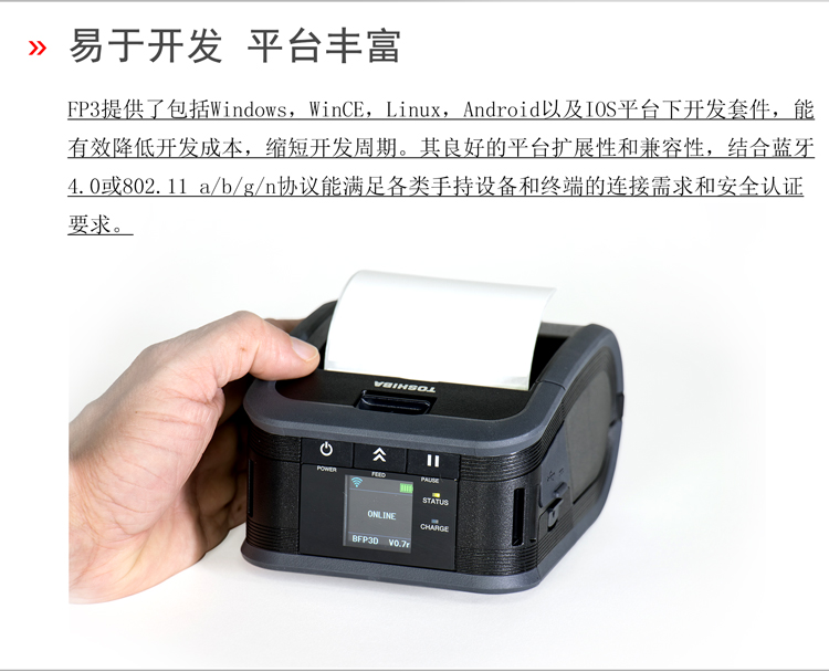 東芝將高性能移動(dòng)打印技術(shù)帶到你的手中,F(xiàn)P3D標(biāo)準(zhǔn)版3寸便攜式熱敏打印機(jī),擁有6IPS(152mm/s)高速打印、彩色中文液晶屏等技術(shù),蘊(yùn)含著東芝對(duì)于便攜性、可靠性和高性能的承諾,滿(mǎn)足各類(lèi)便攜打印的應(yīng)用需求。