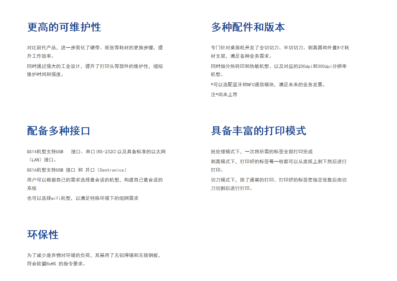 | 標準接口 | GS14及TS14機型(串口(RS-232C), LAN10/100 Base, USB2.0, USB Host) GS16及TS16機型(并口(Centronics), USB2.0, USB Host) | |