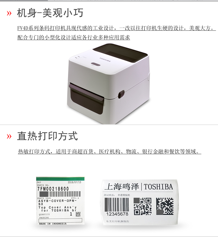 東芝B-FV4D系列出色的連接性、易用性和可維護性,配合各種打印速度和多種可選件,能滿足廣泛的行業應用。小型化設計為您省出更多寶貴的桌面空間。東芝B-FV4D設計時尚精致,榮獲2015 iF產品設計大獎與良好的性能相得益彰。廣泛的應用領域:制造業 / 汽車業 / 重工業 / 鋼鐵業 / 造紙業 / 林業 / 化工業 / 制藥業 / 紡織業 / 零售業 / 運輸與物流 聯系人:李先生 手機:1892
