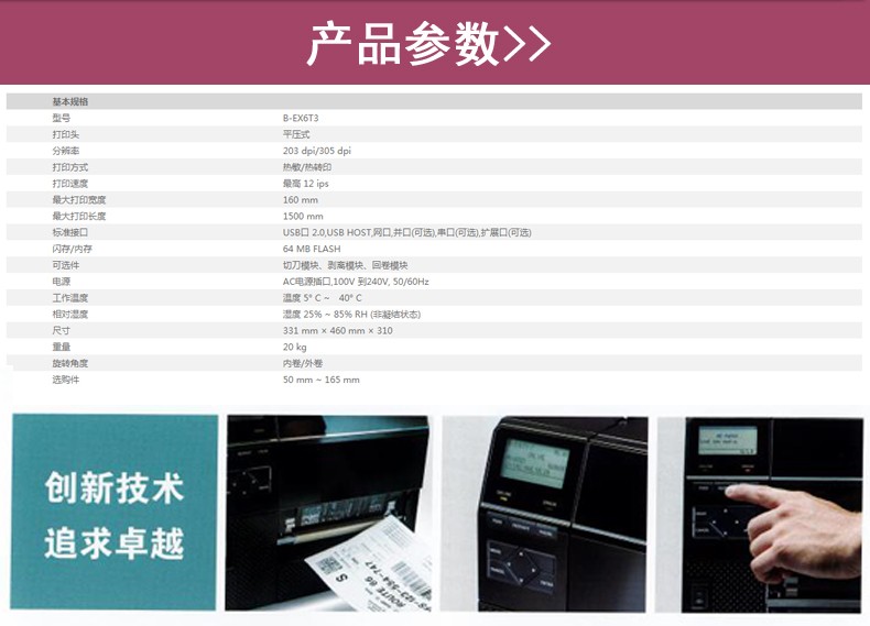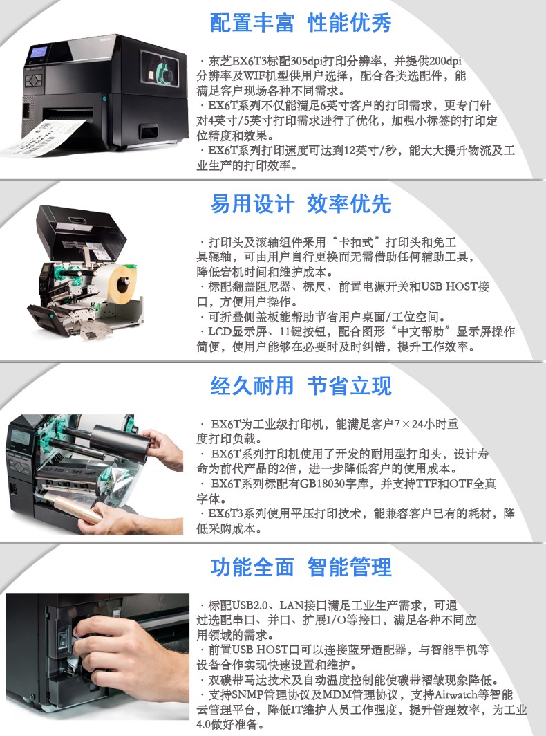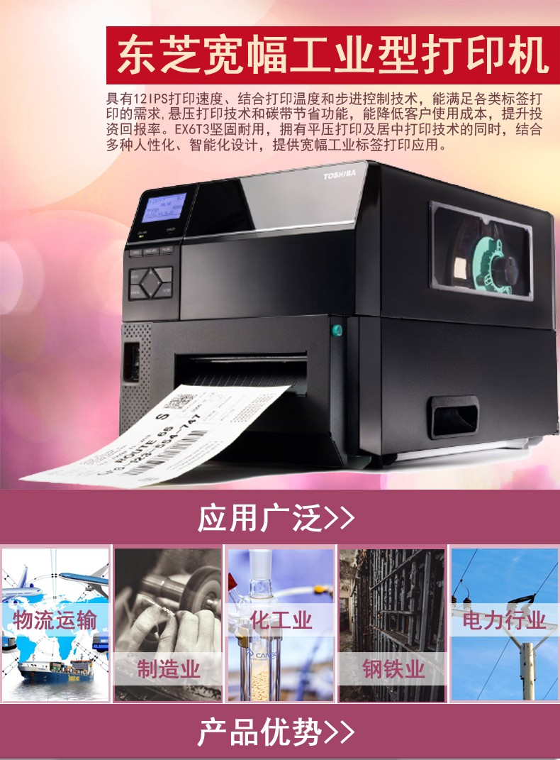 具有12IPS打印速度、結合打印溫度和步進控制技術,能滿足各類標簽打印的需求,懸壓打印技術和碳帶節省功能,能降低客戶使用成本,提升投資回報率。EX6T3堅固耐用,擁有平壓打印及居中打印技術的同時,結合多種人性化、智能化設計,提供寬幅工業標簽打印應用。廣泛的應用領域:物流運輸 / 制造 / 化工 / 鋼鐵 / 電力行業 聯系人:李先生 手機:18929304946 陳小姐(業務):189293049