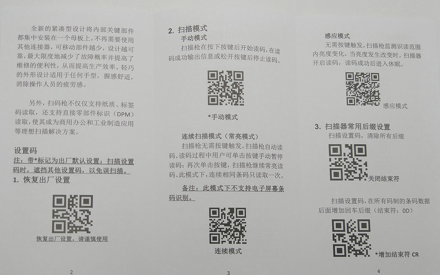 1 .恢復(fù)出廠設(shè)置連續(xù)掃描模式(常亮模式)掃描槍無需按鍵觸發(fā),掃描槍自動讀碼。讀碼過程中用戶可單擊按鍵手動暫停讀碼;再次單擊按鍵,掃描槍繼續(xù)常亮讀碼。此模式下,連續(xù)相同條碼只讀取一次。關(guān)閉結(jié)束符備拉廷衛(wèi)比摸式王王直盆生區(qū)通崖盜碼識別。掃描設(shè)置碼,在所有碼制的條碼數(shù)據(jù)后面增加回車后綴